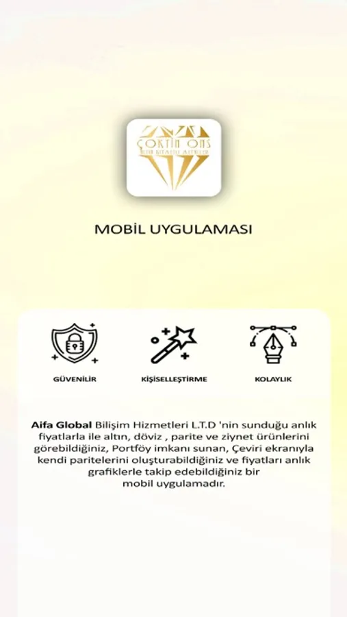 Aifa Global Bilişim Hizmetleri L.T.D 'nin sunduğu anlık fiyatlarla ile altın, döviz , parite ve ziynet ürünlerini görebildiğiniz , Portföy imkanı sunan, Çeviri ekranıyla kendi paritelerini oluşturabildiğiniz ve fiyatları anlık grafiklerle takip edebildiğiniz bir mobil uygulamadır.