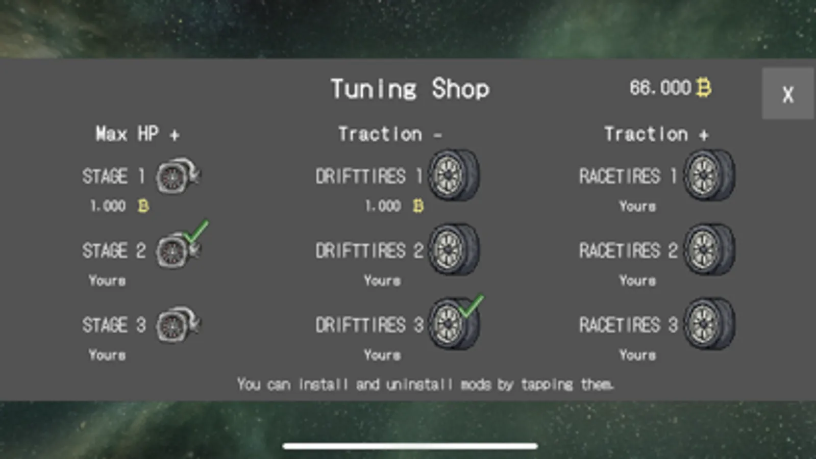 Übernehme die Kontrolle über dein Schicksal, indem du dein Auto mit einer Vielzahl von Reifen- und Motor-Upgrades anpasst. Feile an deinem Fahrzeug bis zur Perfektion, verbessere seine Driftfähigkeiten oder steigere seine Geschwindigkeit. Spüre den Nervenkitzel, wenn dein modifiziertes Gefährt jede Strecke beherrscht, die es berührt!