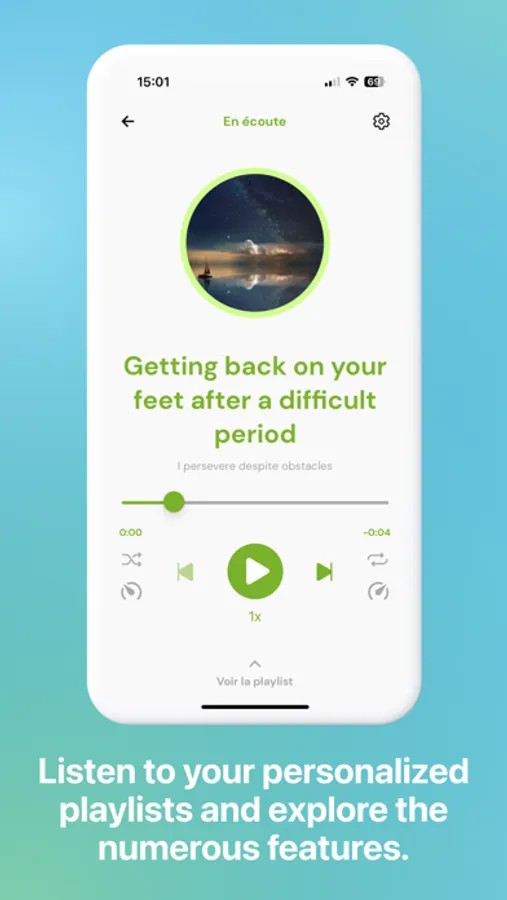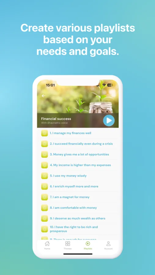 Create your personal playlists with the affirmations that suit your needs and goals; you can listen to your playlists as you please: in the shower, while jogging, while cleaning, to relax...Whatever suits you.