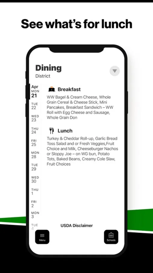 Within the dining section, you'll find an easy to navigate, weekly menu, sorted by day and meal type.