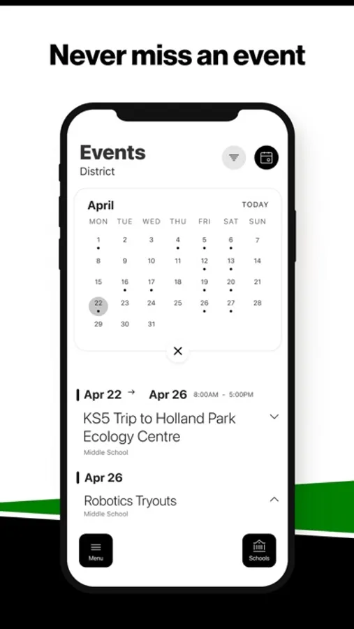 The event section shows a list of events throughout the district. Users can add an event to their calendar to share the event with friends and family with one tap.
