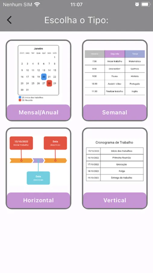 Este aplicativo é uma ferramenta para auxiliar na criação de cronogramas. Ele possui modelos prontos de cronogramas para você apenas inserir suas informações, também existem algumas possibilidades de personalização, como: alterar cor do plano de fundo, tamanho da fonte, cor da fonte e outros.