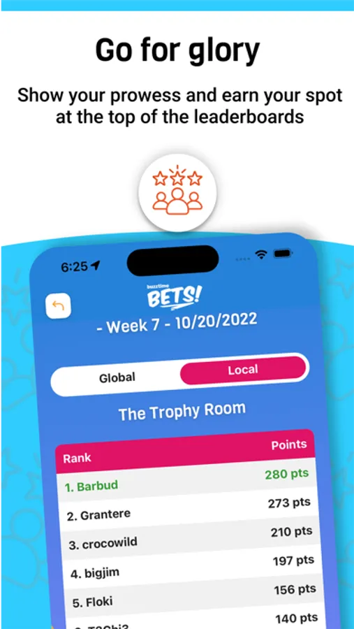 Get the Buzztime Bets app and get in the game! Put your skills to the test in our ever expanding library of games. Compete with others to earn points and climb the leaderboards.