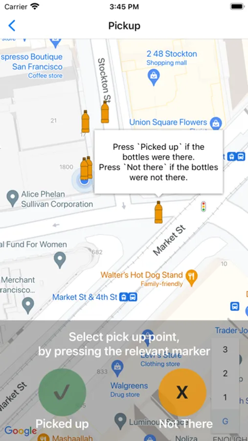 Simply drop your pickadon, those empty bottles, outside your front door. Open the app and mark the drop location. The magic begins here! Anyone willing to collect bottles can view available drop points on the app, making it a breeze for them to collect and earn the bottle deposit money.