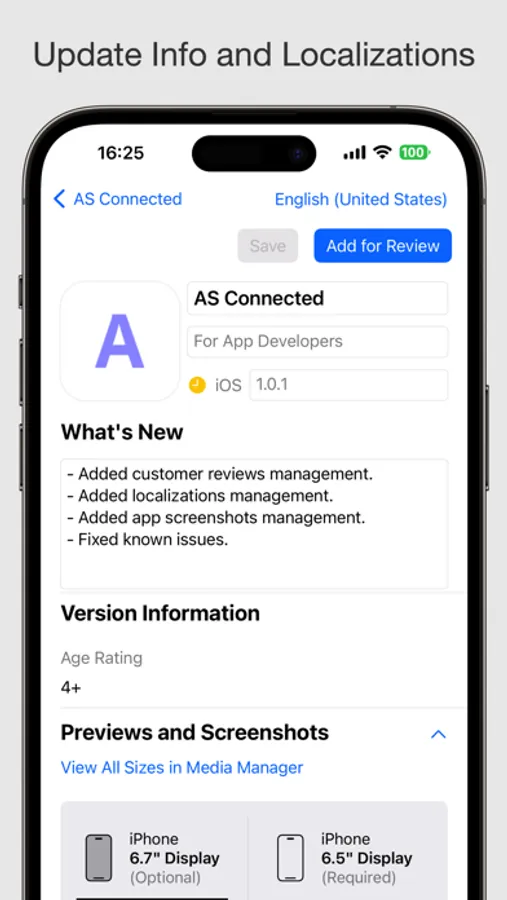 - Add app versions for review, submit them for review, or cancel submissions that are waiting for review.