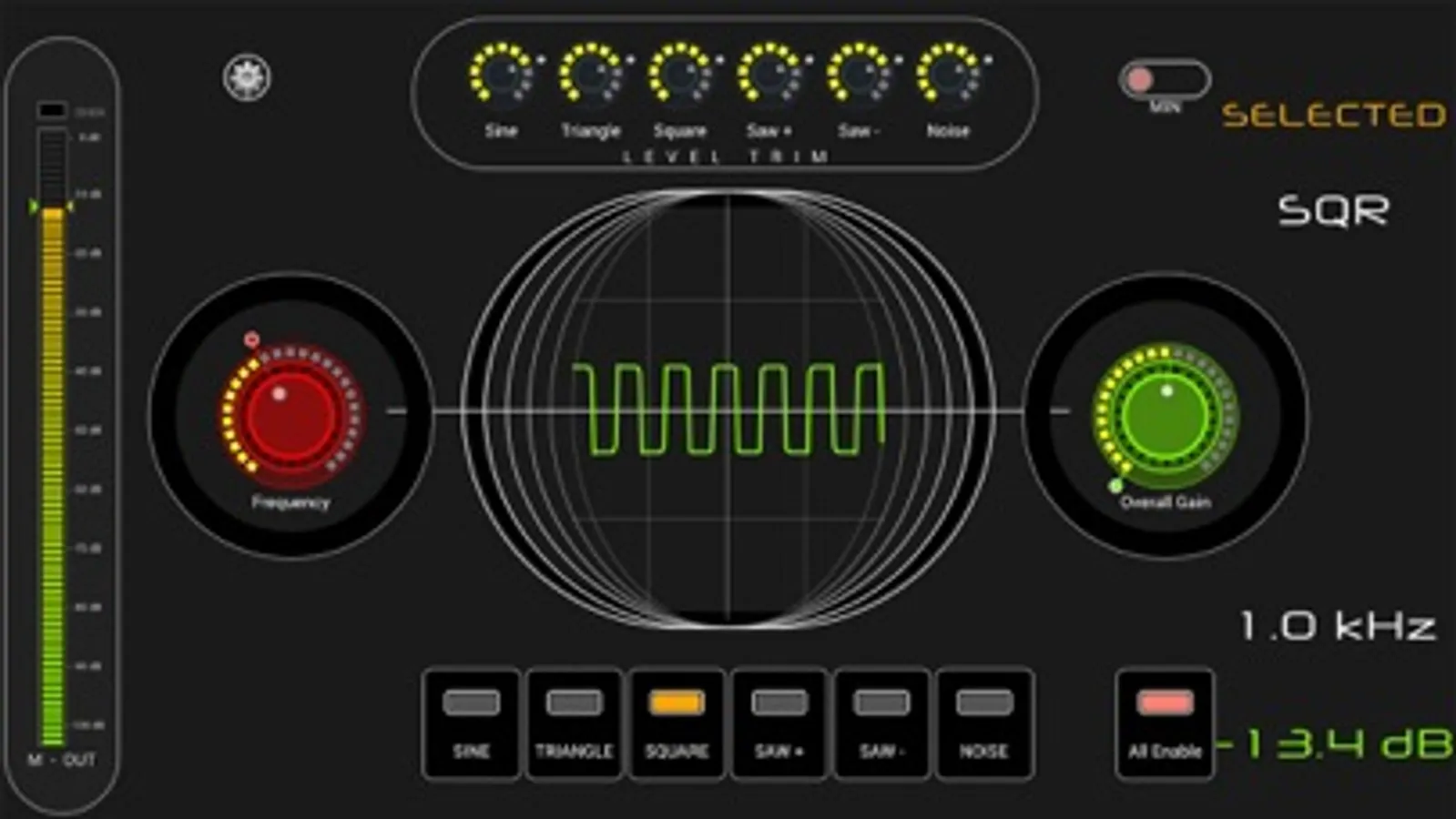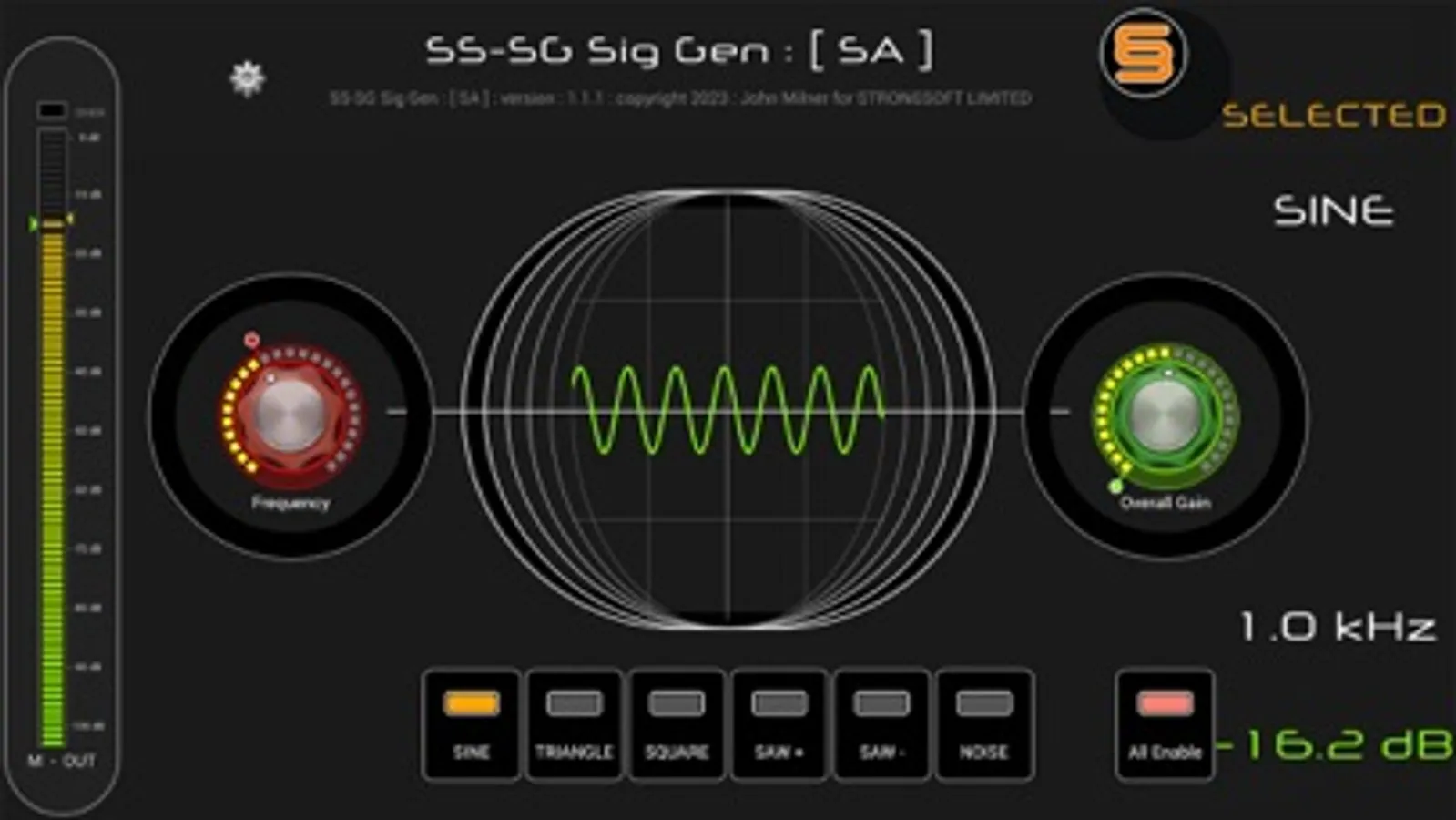 SS-SG is an AUv3 and standalone Signal Generator featuring Sine, Triangle, Saw+, Saw-, Square and Noise waveforms, visualisation and comprehensive metering.