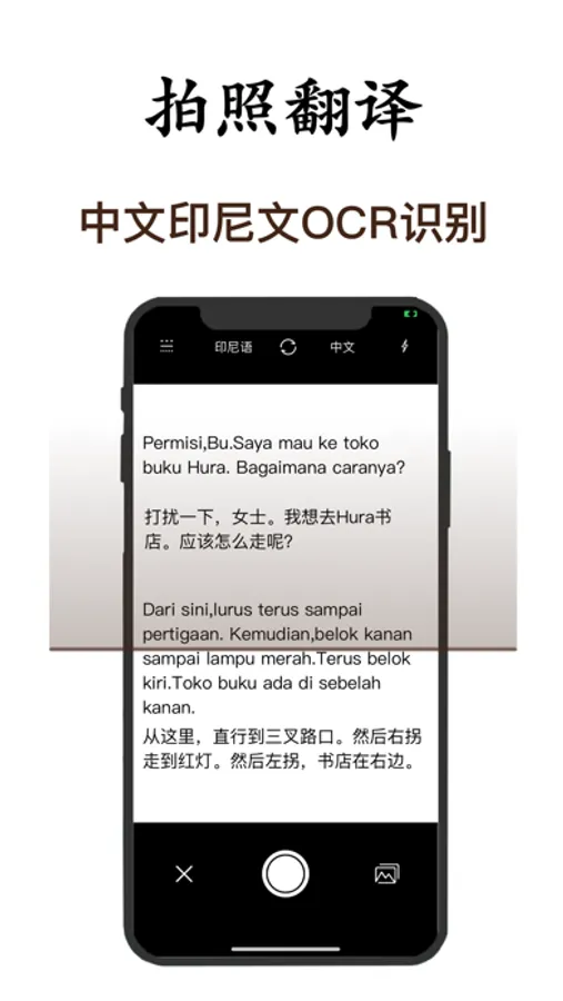 超级精准的ocr图片识别,支持手机拍照及相册中文与印尼文照片,轻轻一按翻译结果就显示,绝对是出行旅行识别路标菜单的必备工具。