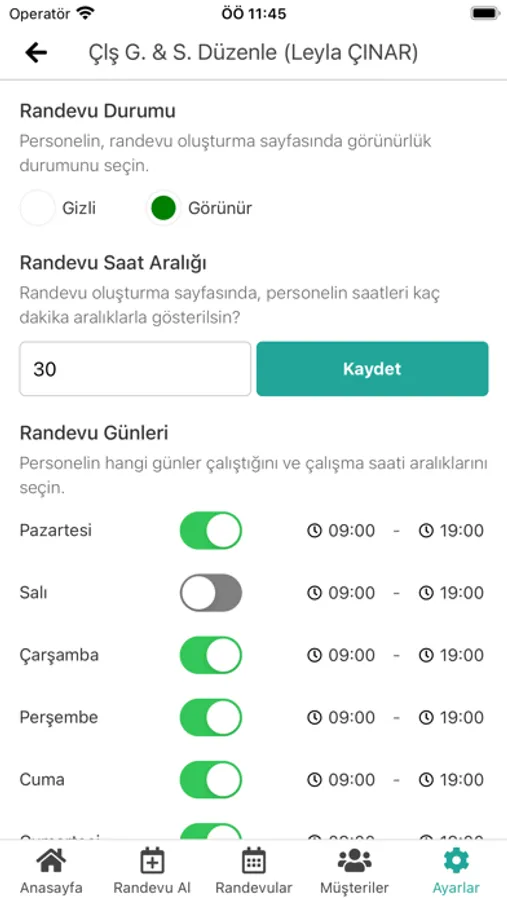 • Personellere ayrı ayrı hizmet ve çalışma günü/saati ayarlayabilirsiniz.