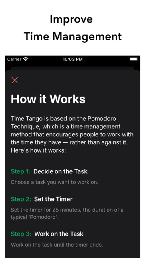 Introducing Time Tango, the minimalist Pomodoro timer app designed to optimize productivity and focus. It's not just a timer, it's your personal productivity companion, perfectly crafted for iOS.