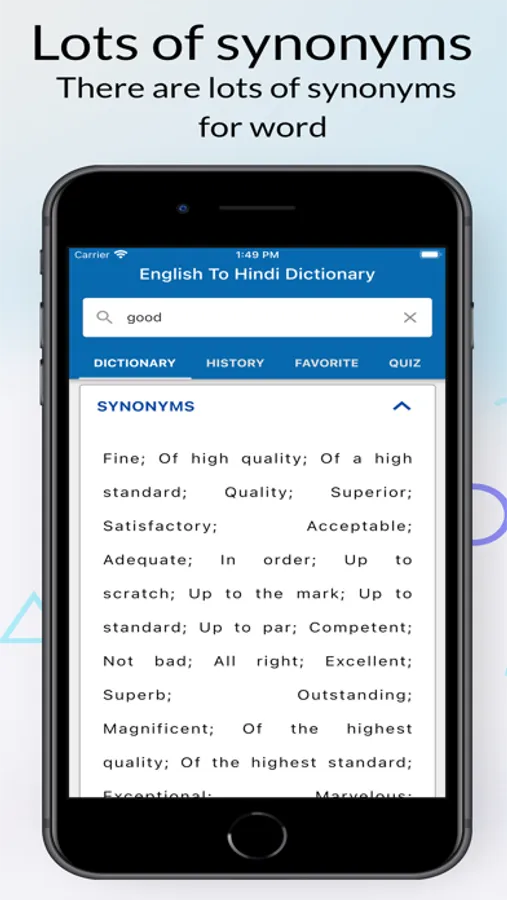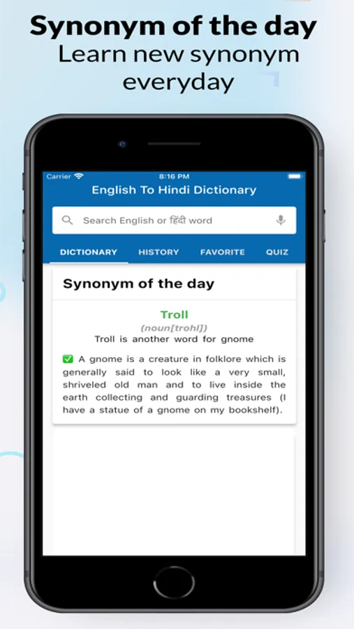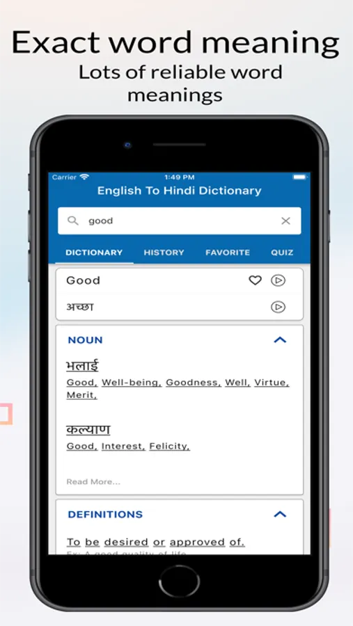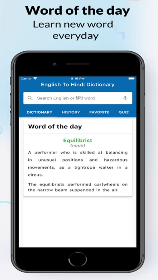 Discover the power of language with our English-Hindi dictionary app. Search and find word meanings in both English and Hindi with accurate definitions, examples, synonyms, antonyms and more. Keep track of your learning progress by marking words as favorites and exploring their history. Enhance your vocabulary by playing interactive word quiz games and improve your language skills on the go. Download now and start exploring the rich world of language. Core features: Dictionary, English, Hindi, Vocabulary, Quiz, Language Learning, Synonyms, Antonyms.