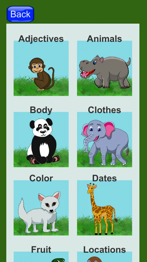 Current word categories are: adjectives, animals, body parts, clothes, color, dates, fruit, locations, and school.