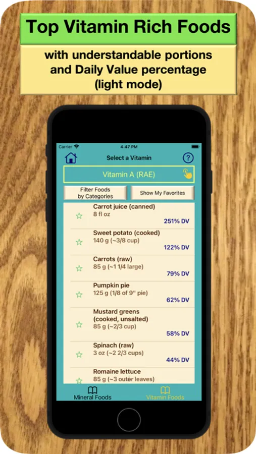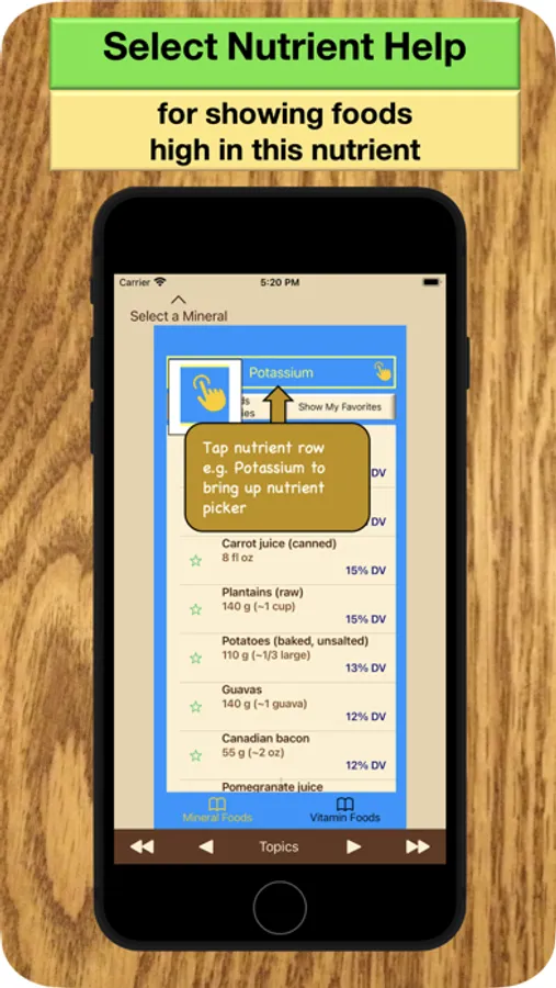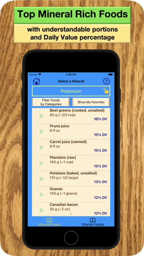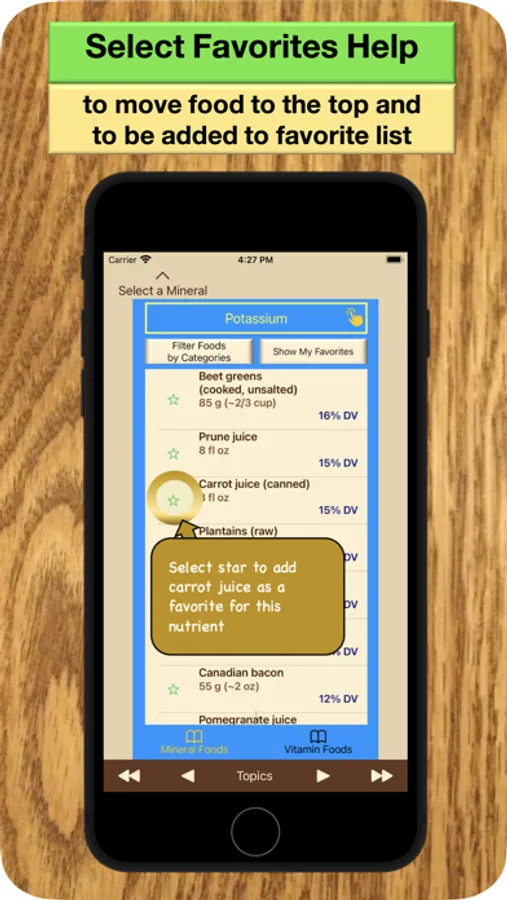 1. Select the vitamins or other nutrients of interest then view a list of foods. Really like a specific food? Mark it and you’ll see your favorites at the top.