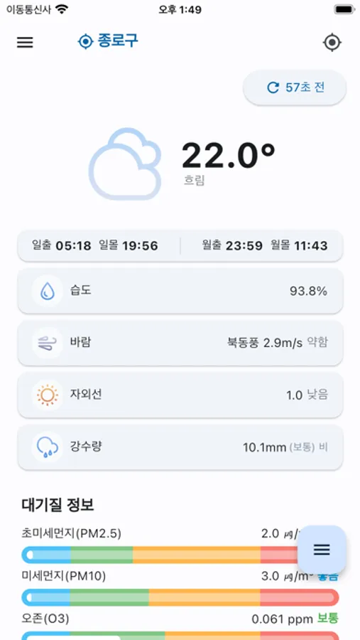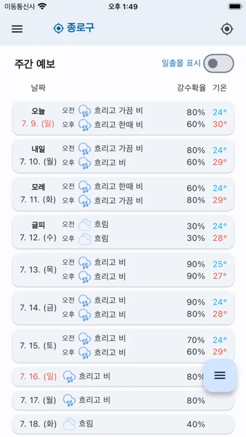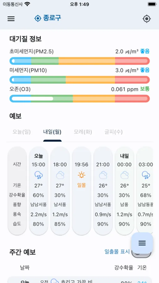 대한민국 현재 날씨, 미세먼지, 시간별 예보, 주간 예보 정보 제공