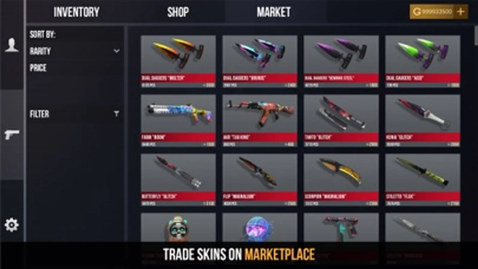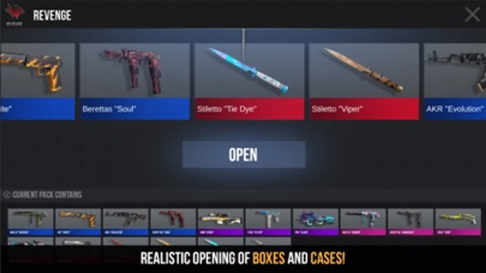 New Season 5 is already in the game! New Fireborn collection and Revenge case are waiting for you to open them! New Stiletto knives and Dual Berettas pistols are in our simulator in high quality 3D models! You can sell duplicates on the market and buy even more cases and collect the whole inventory! Entire collection of skins is available in the app!
