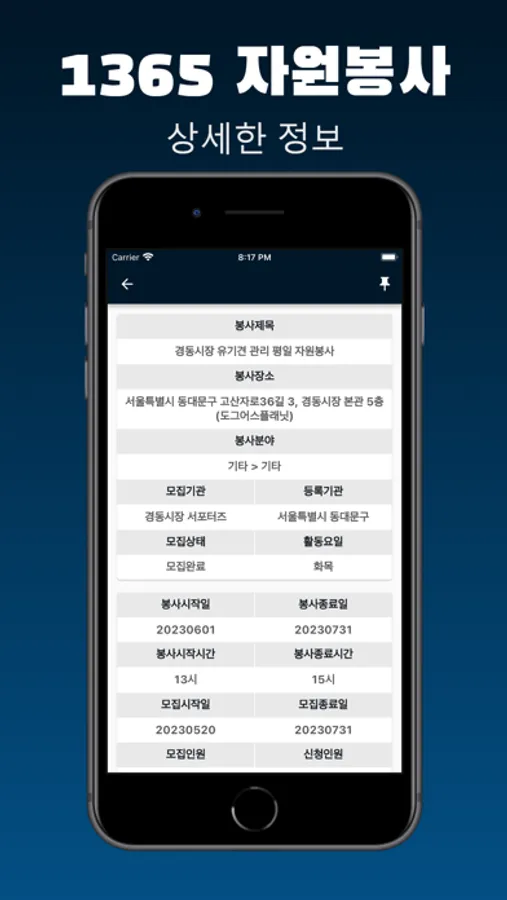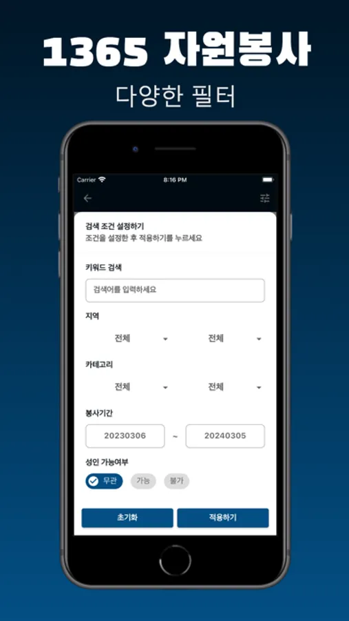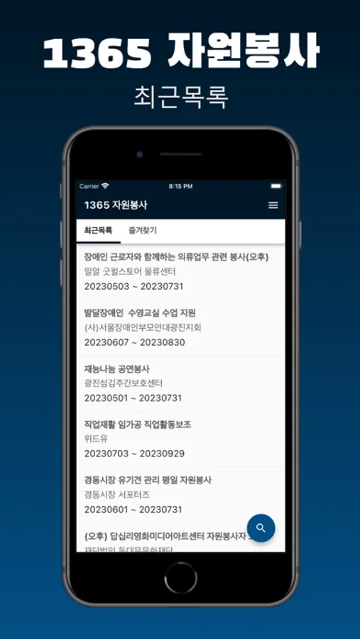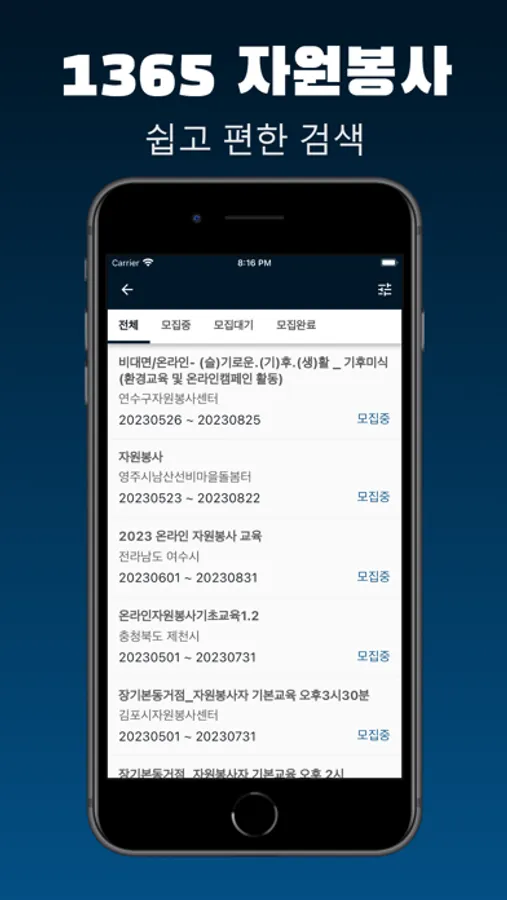 1365 자원봉사 포털에서 제공하는 정보를 한데 모아, 단 몇번의 클릭만으로 지역별, 기간별로 내게 맞는 자원봉사를 찾아볼 수 있습니다.