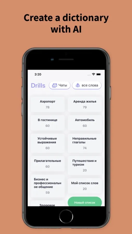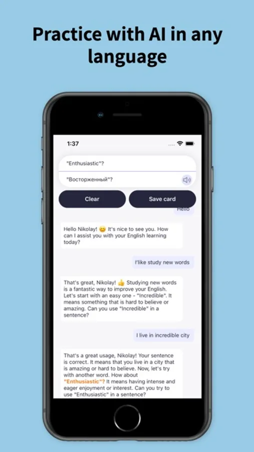 Drills offers a unique opportunity to communicate with artificial intelligence in the role of a tutor. You can ask questions, request explanations, and get additional information about words and their usage.