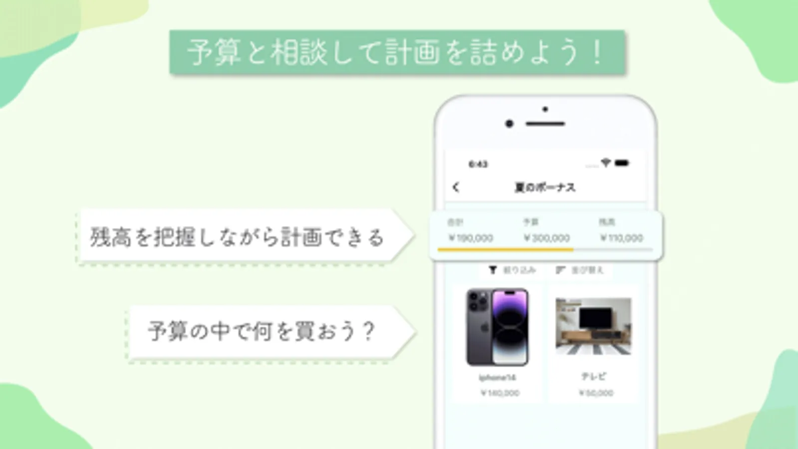 3. 「夏のボーナス」の計画を作成します。予算は30万円です。この計画には新しいiPhoneを追加しましょう。現在の予算残高は15万円で、5万円のテレビも買える余裕があります。「テレビ」も「夏のボーナス」に追加してみましょう。