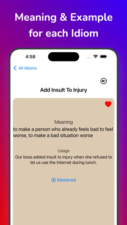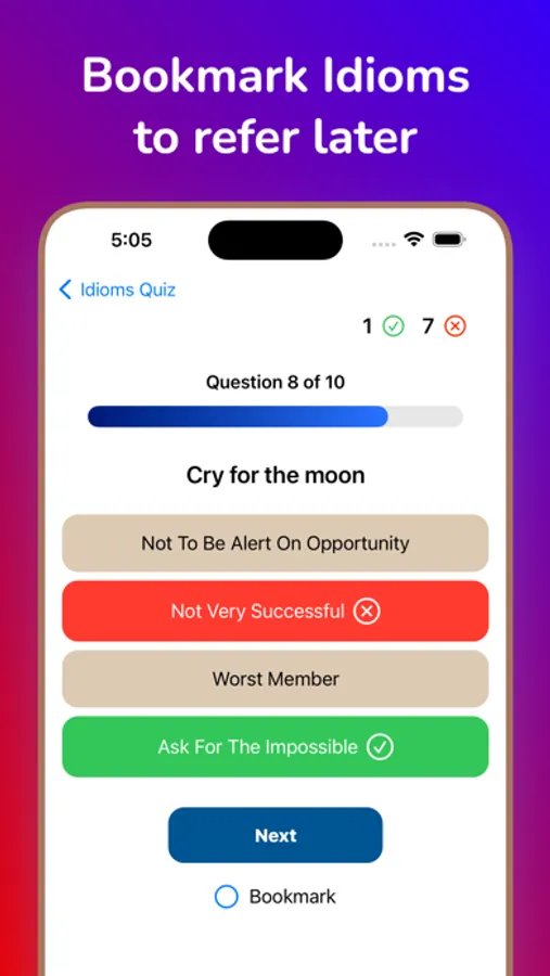 Bookmark important Idioms and Phrases and access them easily. This App is an offline App Internet is not required to use this App.