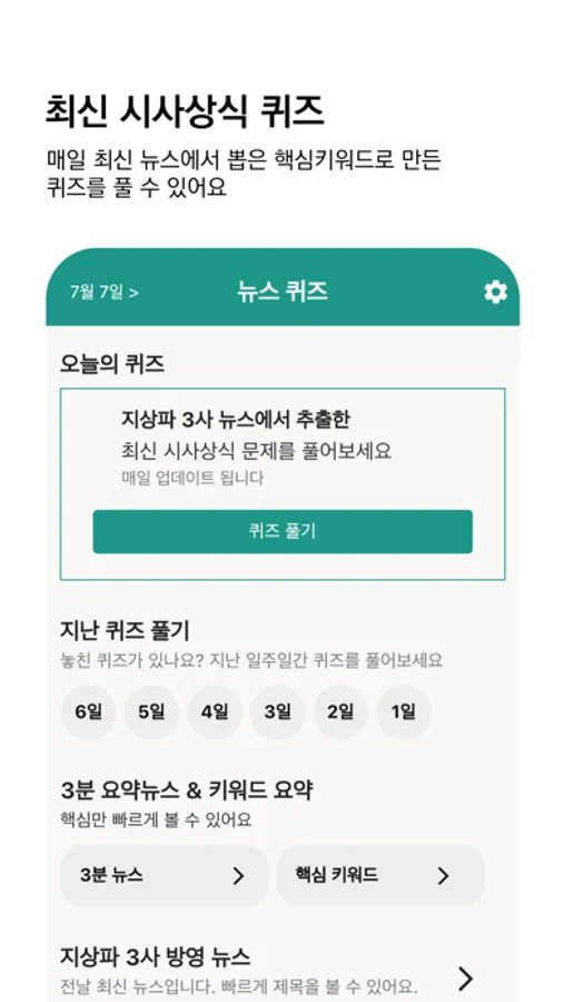 날마다 뉴스에서 추출한 핵심 키워드를 이용해 만든 최신 시사상식 퀴즈를 제공합니다.