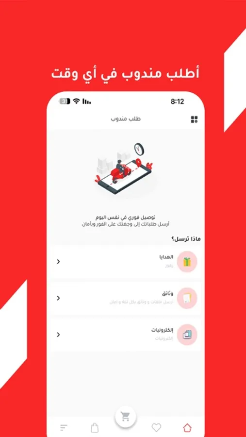 طلب مندوب: إذا كنت بحاجة إلى شراء منتجات خاصة أو طلبات غير متاحة في قائمة المطاعم أو المتاجر، يمكنك استخدام خاصية طلب مندوب. قم بوضع طلبك المحدد واحدث الوصف الكامل للمنتجات أو الخدمات التي تحتاجها، وسيتم توفير مندوب لتنفيذ الطلب وتوصيله لك.