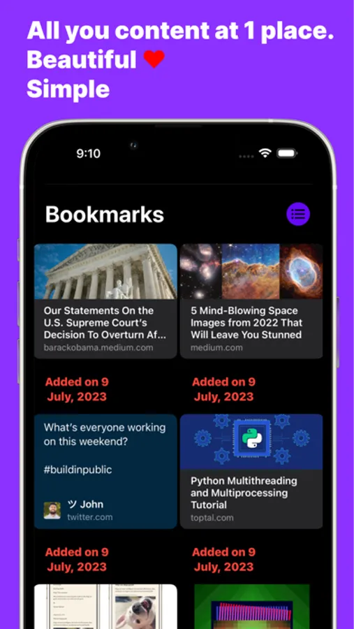 Bookmarks intelligently creates categories based on the links you provide, making it effortless to organize and locate specific types of content. Whether it's Twitter links, Medium articles, YouTube videos, or Instagram posts, Bookmarks keeps everything neatly sorted.