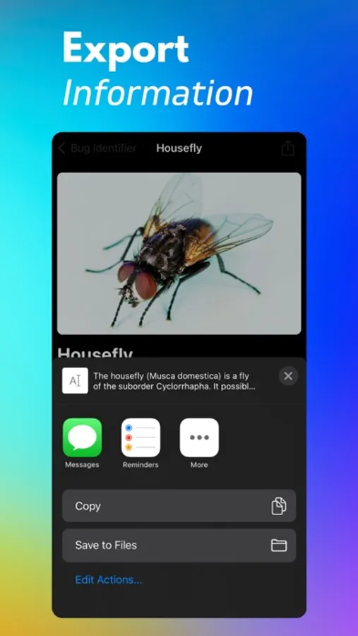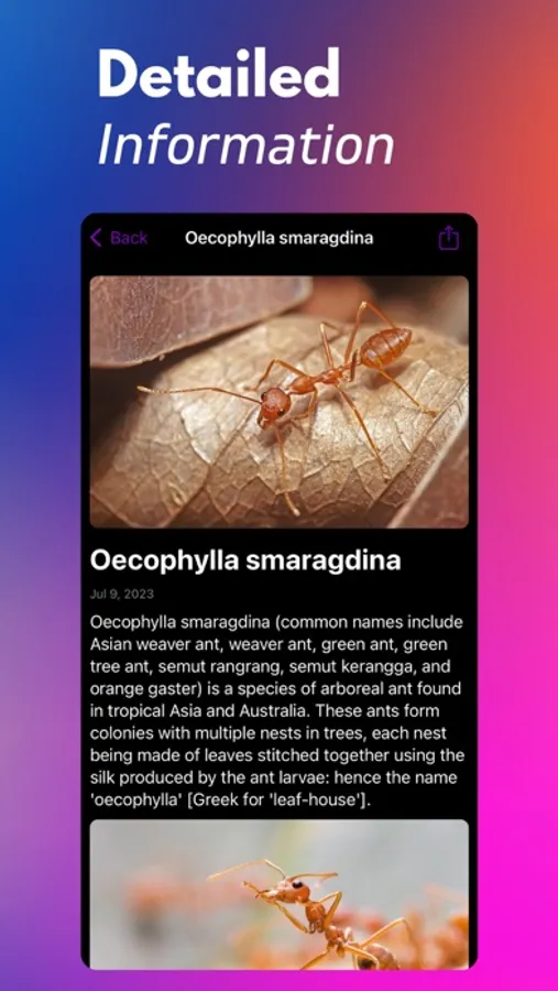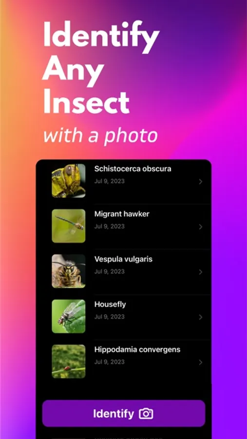 Extensive Database: Our app is equipped with an extensive database of insects and spiders, compiled from the most reliable sources. You can access detailed information about each identified species, including physical characteristics, habitat, behavior, and more. Expand your knowledge and become an expert on a wide range of insect species.