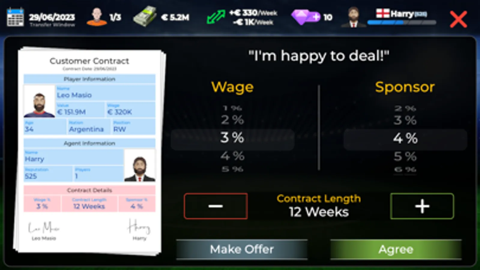"Welcome to our thrilling football agent game, where you have the opportunity to build a successful agency and manage the careers of talented players on their journey to stardom. As an agent, you'll have the power to attract players to your agency, negotiate contracts, and guide them to the top of the football world.