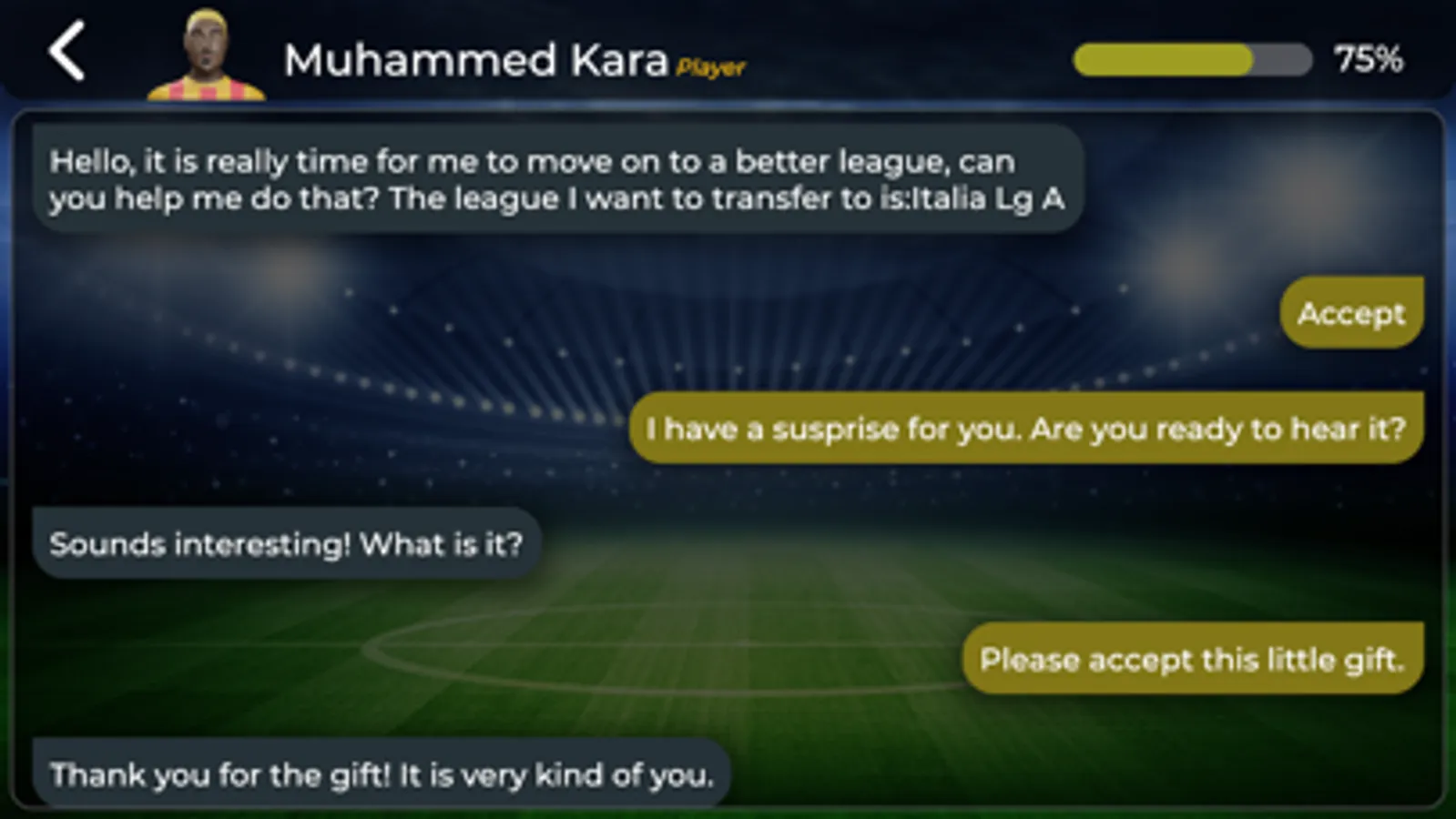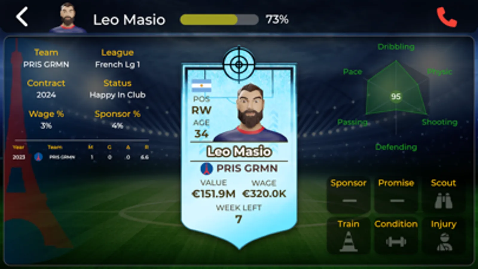 Manage your finances wisely by purchasing stocks of clubs and making profitable investments. Interact with clubs and players, and build strong relationships by delivering on your promises. The better your relations, the more opportunities will come knocking on your door.