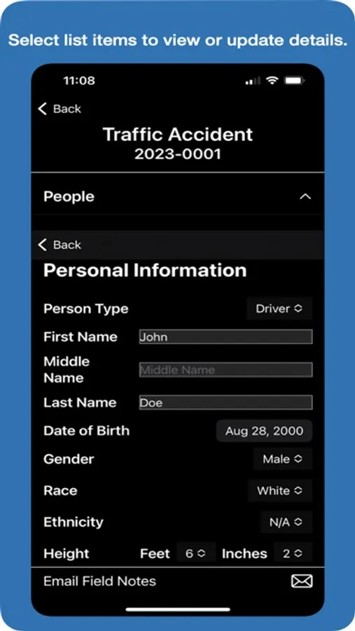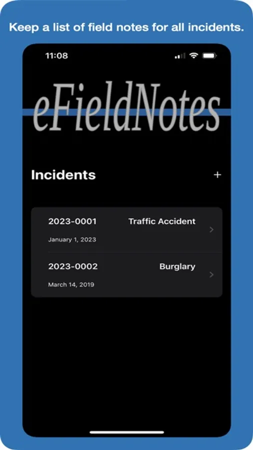 The eFieldNotes app allows users to maintain a list of cases and calls for service (incidents). Incident notes are stored on the device for future reference. Scroll through your list of incidents or tap on a list item to view and update incident details.