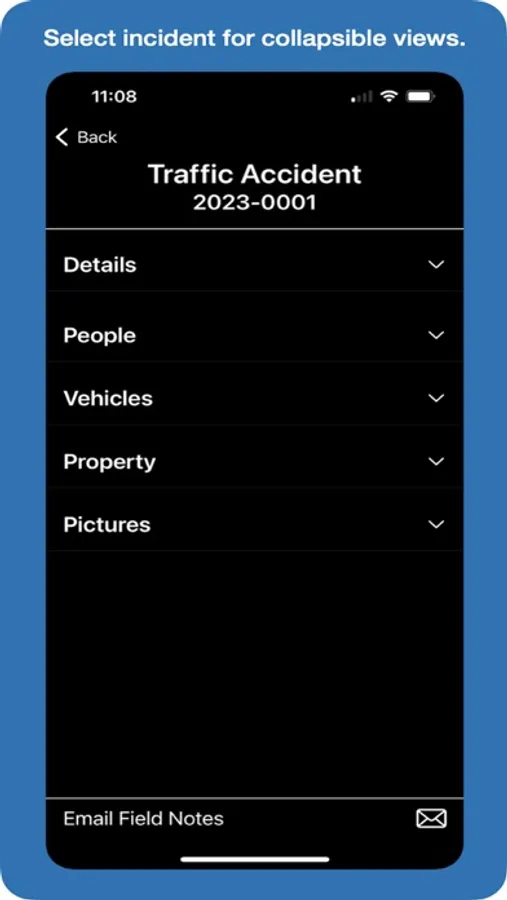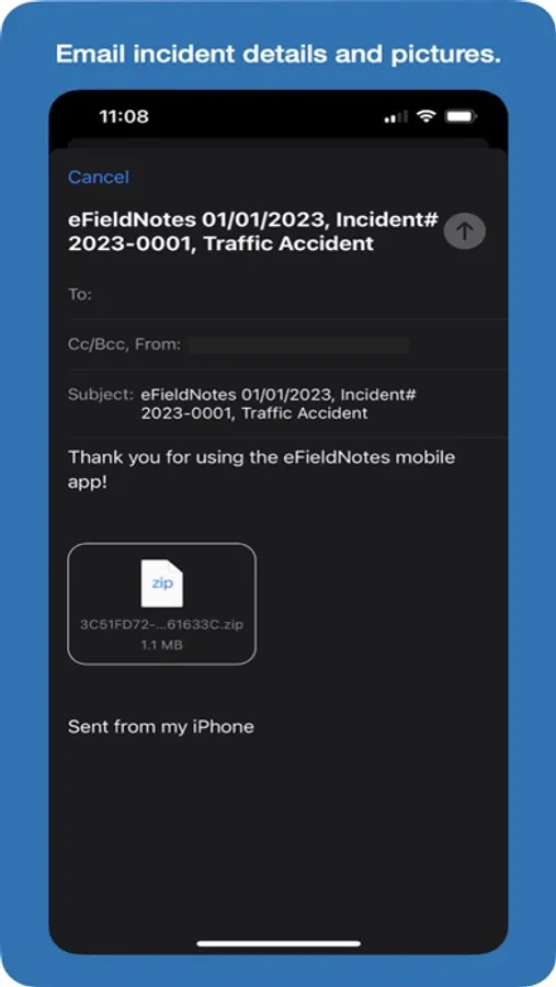 Tap the email icon to share your incidents. Incident details are included in a single email attachment along with all of your incident’s pictures. You can copy and paste notes to streamline report writing, or share the notes you record while assisting the reporting officer.