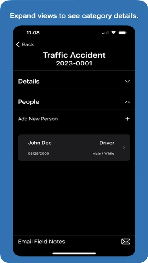 Nearly every law enforcement function, whether investigating a serious crime or handling routine calls for service, requires police officers to record information. The eFieldNotes app allows quick and easy note-taking with only one hand and eliminates the need for a flashlight in low light conditions.