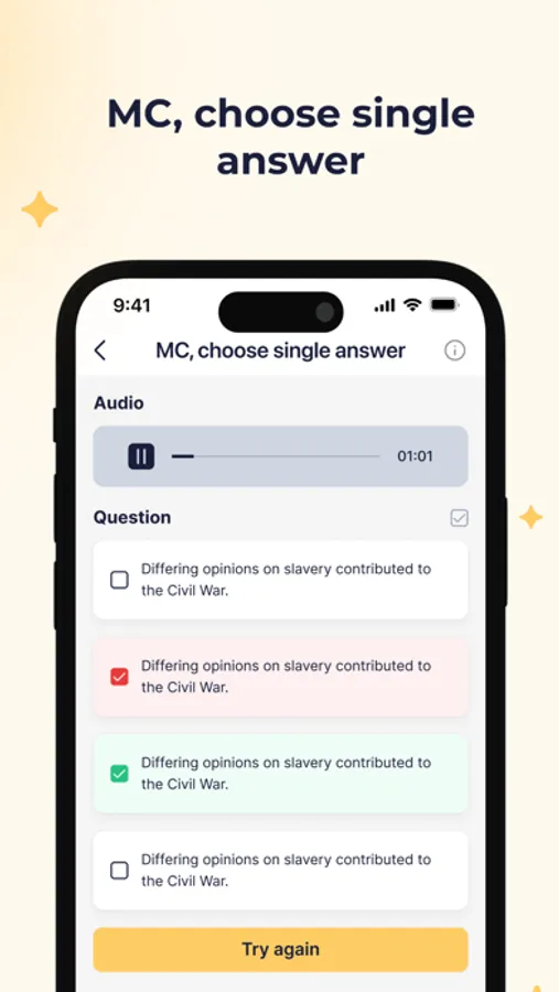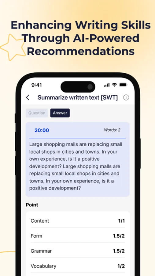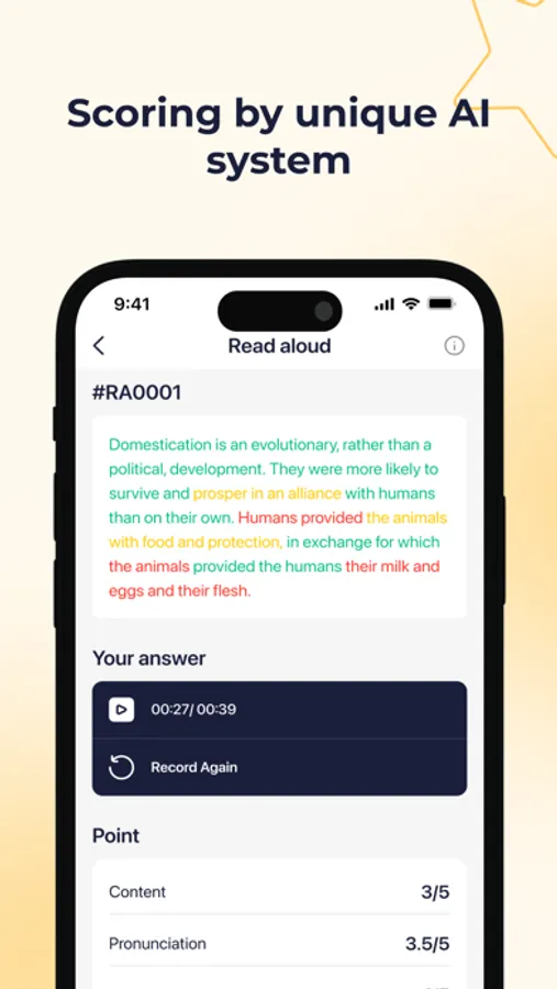 Modeled after the actual PTE scoring, our app ensures you get reliable practice questions results. Dive deep into feedback on speaking, writing, grammar, and much more.