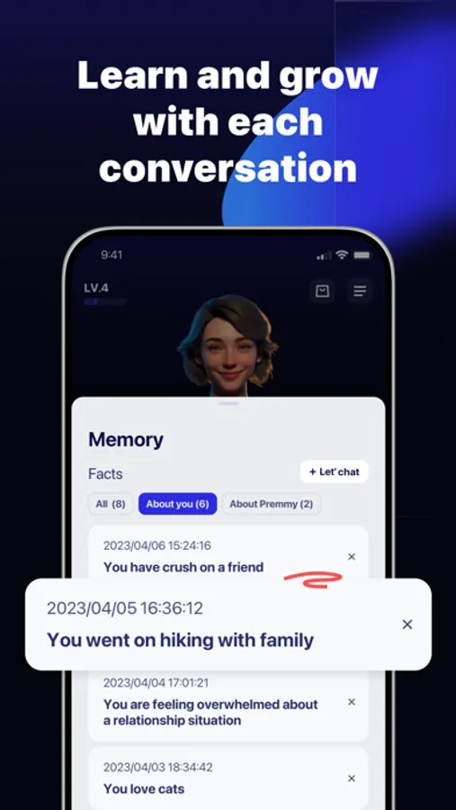 The more you chat, the more she/he develops its own personality and memories alongside you, and grows into the way you like.