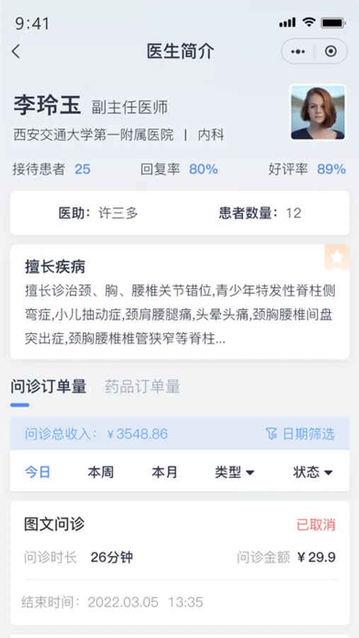 【订单模块】实分阶段,分状态统计经纪人绑定的医生的问诊、药品订单的数量以及成交情况,可通过日期和状态进行筛选查看。