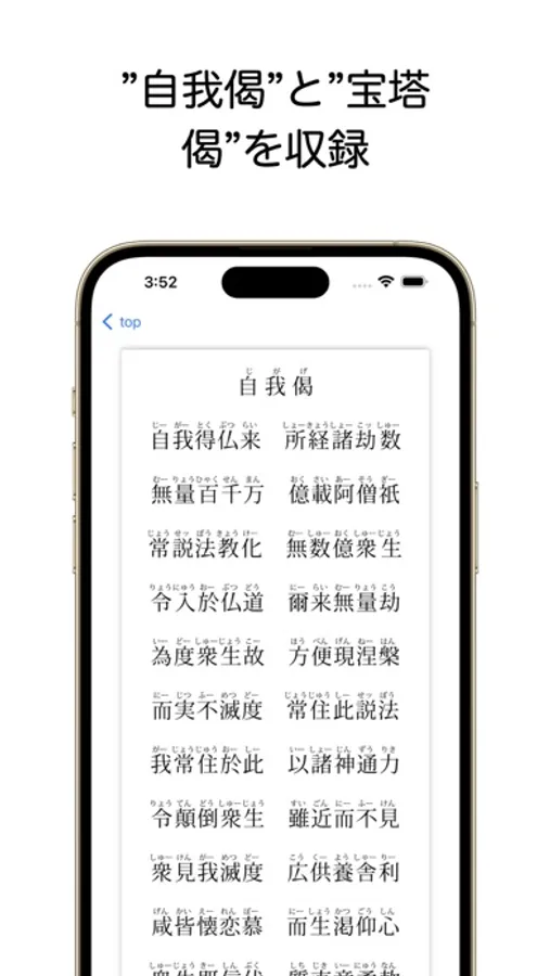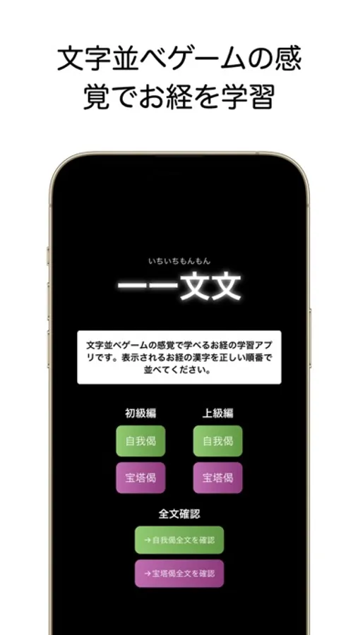 文字並べゲームの感覚で、ランダムに表示される”自我偈”、”宝塔偈”の経文を正しい順番に並べていきましょう。