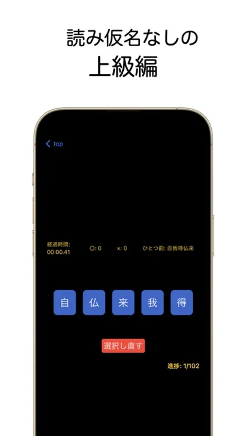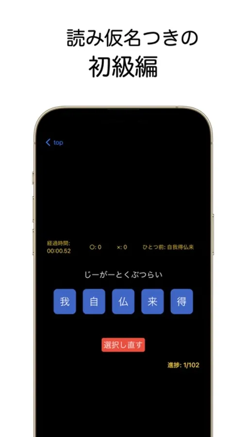 初級編は、お経文のひとフレーズ毎に[読み仮名]が表示されますので、正しい順番で漢字を並べます。