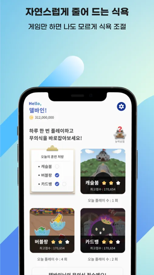 - 게임처럼 만들어진 무의식 훈련을 하면서, 음식에 끌리는 무의식을 수정해보세요! 꾸준한 무의식 훈련은 음식에 노출되는 상황으로부터 나를 보호해주고, 다이어트를 좀 더 쉽게 해 줄 거예요.
