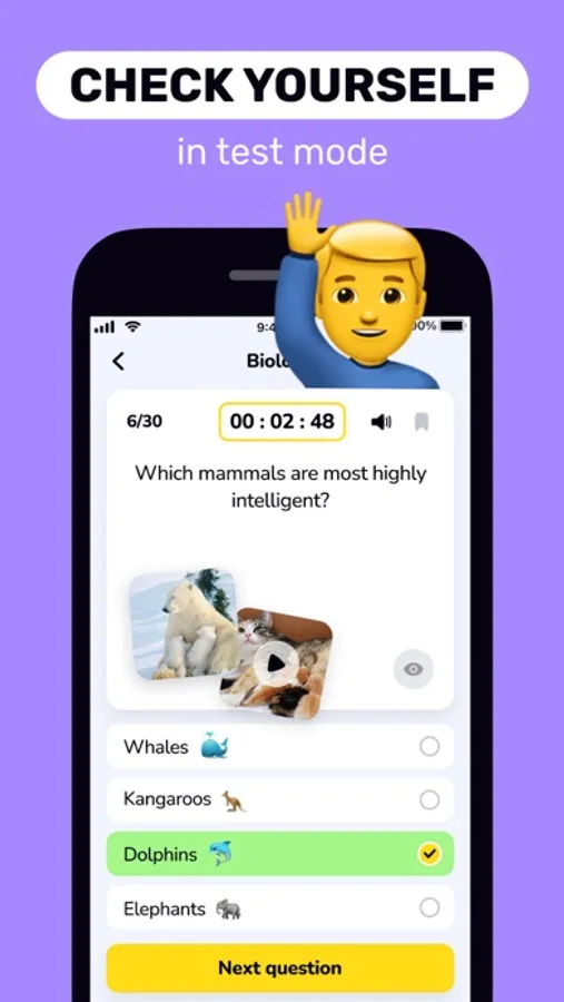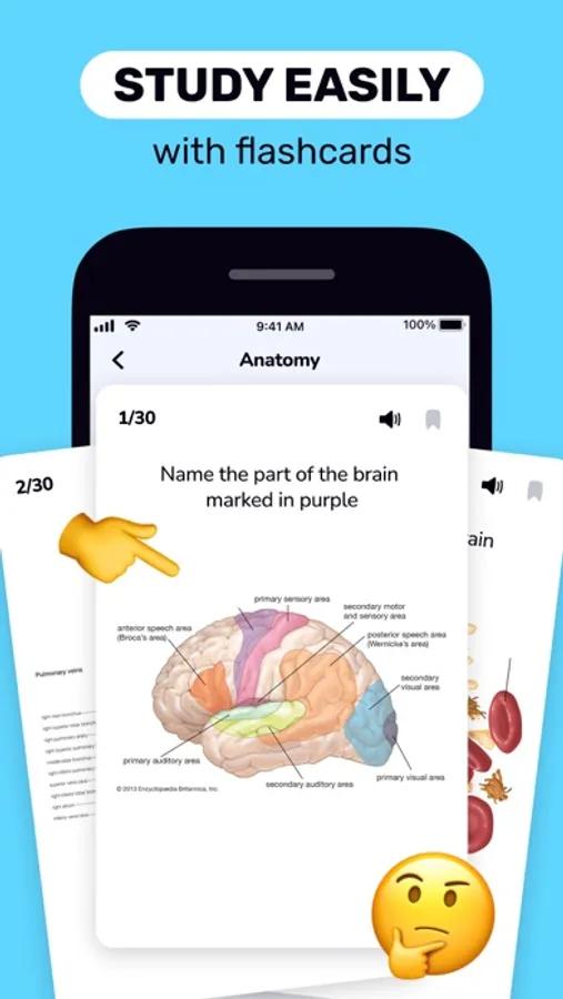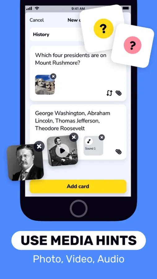 You can add photos, audio and video to each card as a hint or as part of a question.