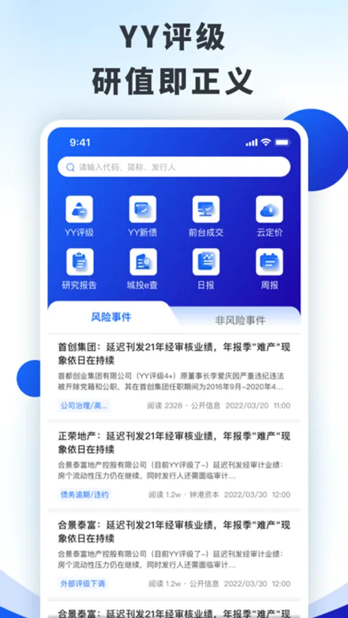 瑞霆狗(深圳)信息技术有限公司旗下APP,公布每日“YY信评定价报告”,信用研究、统计数据公布等。