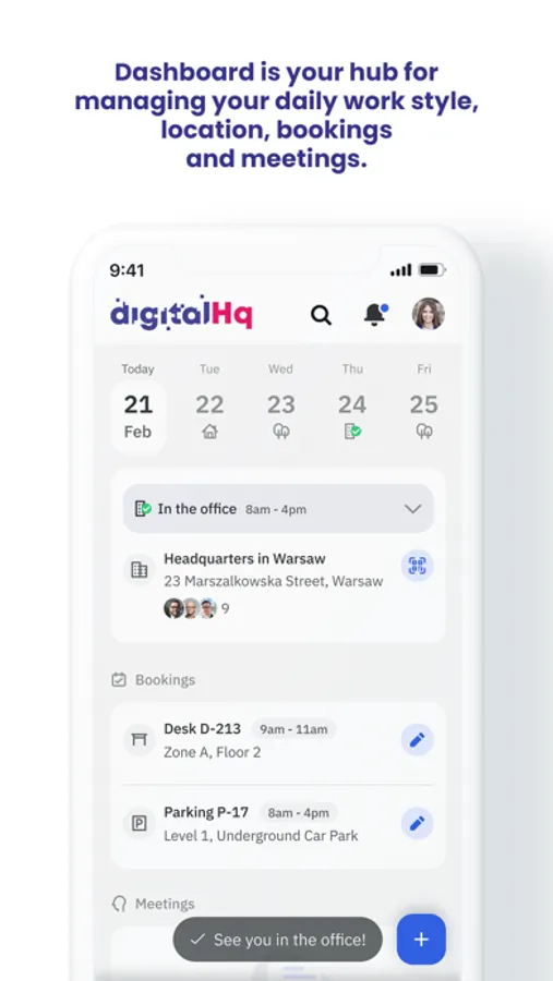 Manage hybrid work in your company with DigitalHQ - an innovative platform supporting the hybrid work model. Create flexible schedules, book office space, and optimize resource utilization to enhance your team's efficiency and optimize office space usage.