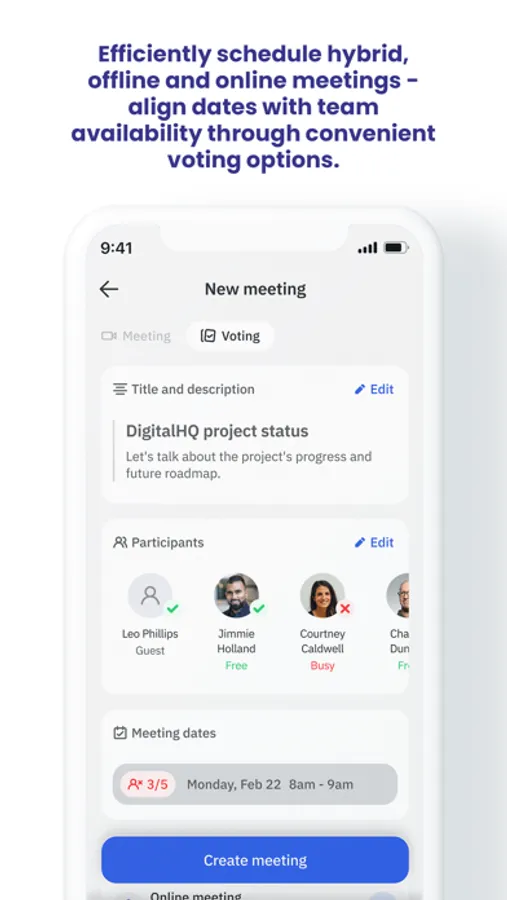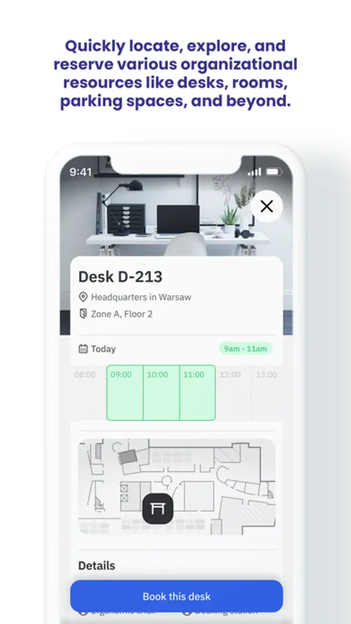 - Space Optimization: Reserve desks, conference rooms, parking spaces, and other office resources. Effectively manage office space by adapting it to the requirements of a hybrid team.
