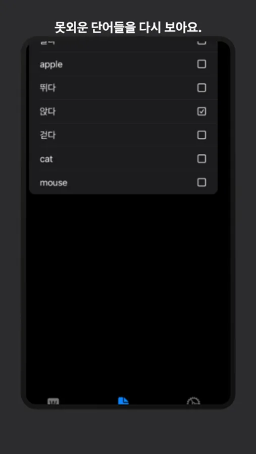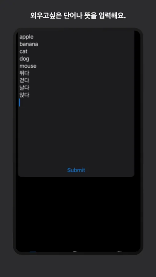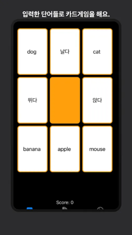 사용자로 부터 영어단어나 뜻을 입력받고 카드게임 형식과 오답을 체크하는 오답노트 형식으로 앱을 구성하여 사용자가 보다 효율적으로 영어단어를 기억할 수 있도록 만든 앱입니다.