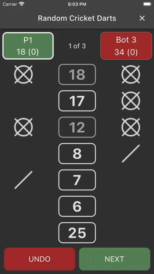 Random cricket darts wil choose six random numbers and the bull. The basic rules are the same as standard cricket. Random Cricket Darts will improve your gameplay. The bot has nine levels from novice up to pro. Try to beat that one. Random Cricket Darts with the 6 random numbers will turn cricket in a totally new challenging game. It will improve your game play on all the numbers you never train on but often need to win a game of darts. No more misses on those untrained big singles. You gone love this game.