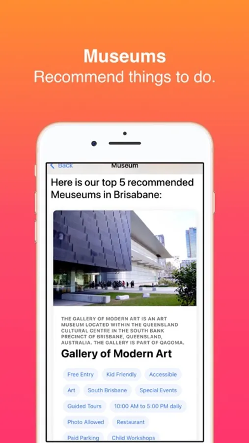 Top Places to Visit: Discover the must-visit attractions in Brisbane. From iconic landmarks to hidden gems, the app showcases the city's best points of interest, complete with descriptions, photos, and ratings.