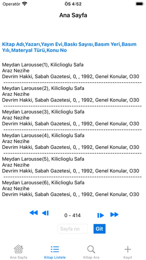 Kütüphanede bulunan tüm kitapları ve kitapların adres vb. Bilgilerini göstermektedir.