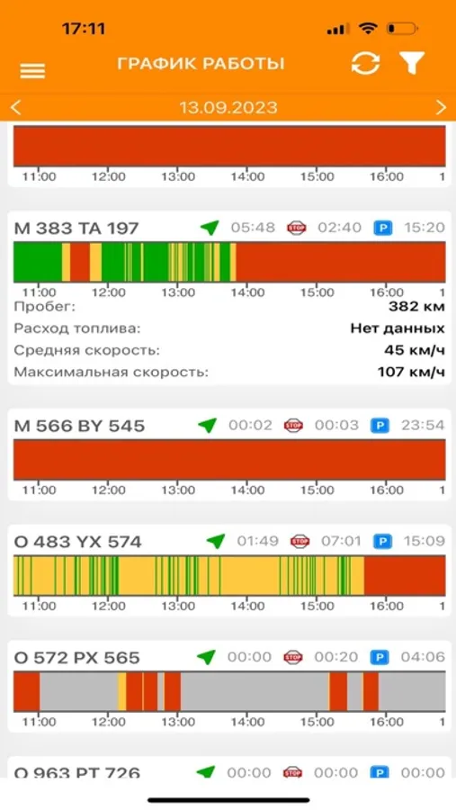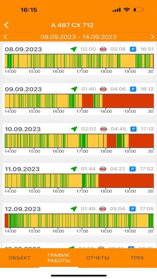 • «График работы» - отображает информацию по работе объектов в графическом виде и визуально демонстрирует активность использования автопарка.