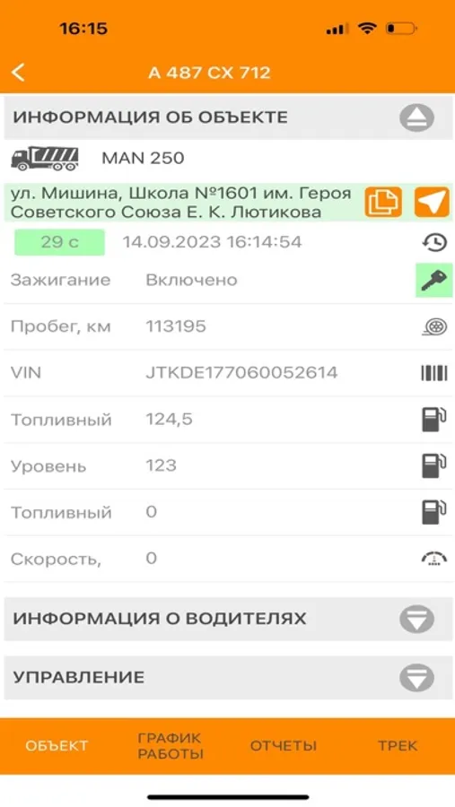 • «Карточка объекта» - позволяет получать информацию с подключенных датчиков и выводить информацию о водителях данного ТС.