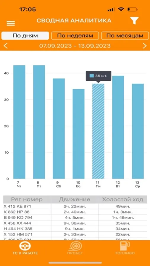 • «Сводная аналитика» - позволяет строить аналитические отчёты по пробегу, топливу и работе транспортных средств по всему автопарку.
