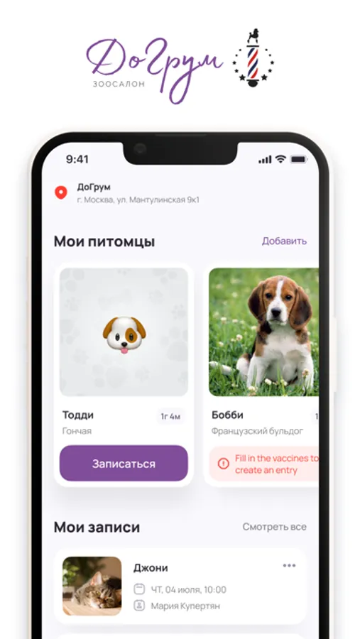 Профили питомцев: Создайте и управляйте профилями каждого из ваших питомцев, включая фотографии, породу, возраст, вакцинацию и любые особые потребности или предпочтения в уходе. Это помогает нашим грумерам обеспечивать персонализированный уход, адаптированный под уникальные потребности вашего питомца.