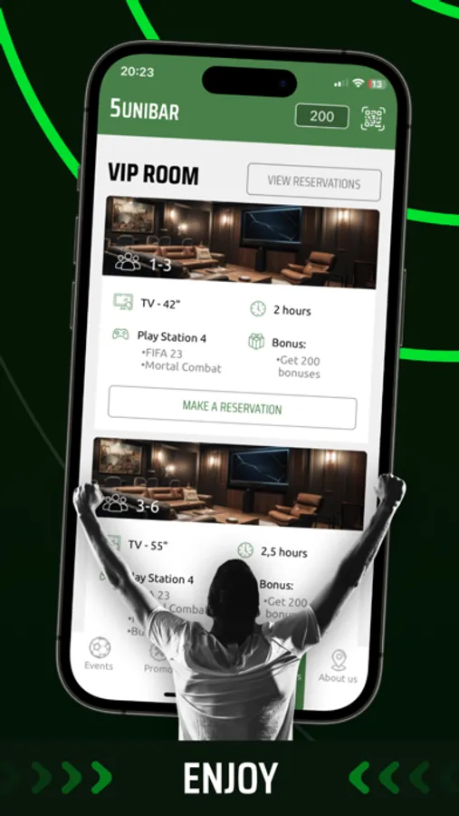 For a truly VIP experience, take advantage of our exclusive VIP rooms. Each room is equipped with its own television and PlayStation console, providing endless entertainment options. Whether you're looking for a cozy space for two to enjoy some gaming, a larger room for a group of 3-6 people, or a spacious area for watching matches together, our VIP rooms cater to your preferences. Additionally, by making your first VIP room booking, you unlock a special welcome bonus of 200 coins, which can be used for discounts and exclusive offers throughout your visit. Just tap the "Show QR Code" button and show it to our attentive staff to enjoy your bonus savings.